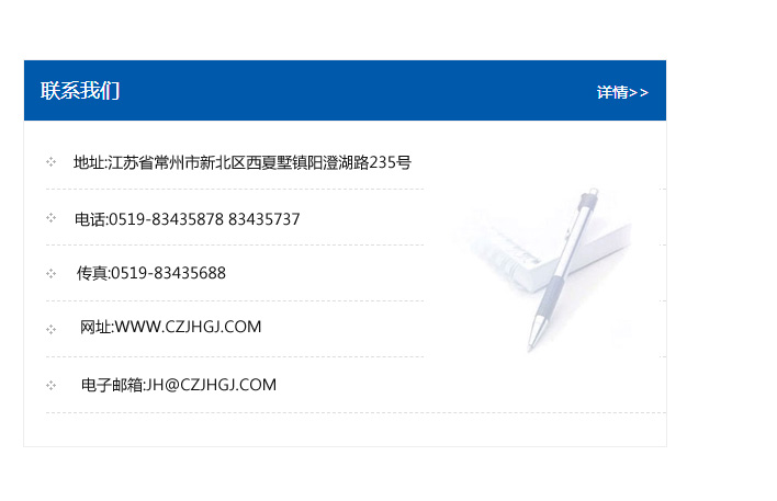 地址:常州市新北區友邦商務大廈1幢16、17層  電話:0519-85101652  傳真:0519-85112595  郵編:213022  網址:www_cz-jiayue_cn.ycyuchi.com  郵箱:xiajifengaa@163.com